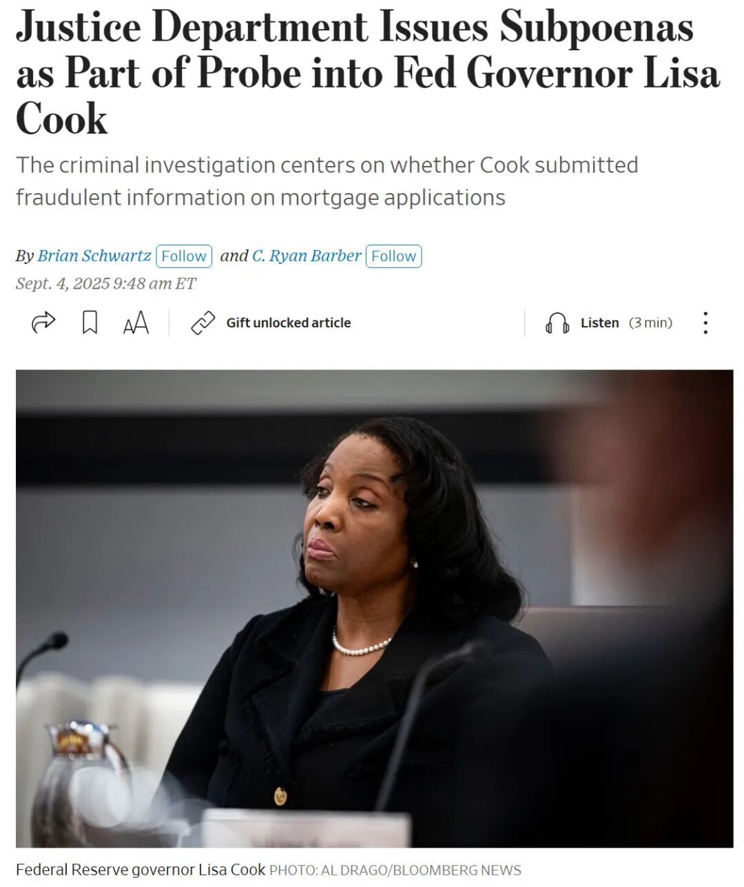 《华尔街日报》引述知情人士消息称,美国司法部已对美联储理事库克展开刑事调查,并发出传票,以调查她是否在抵押贷款申请中提交了虚假信息。